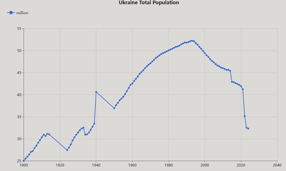 Surely you, so concerned with Ukrainians, knew about the horrifying demographic crisis caused by the capitalist restoration? The millions of lives lost and ruined by unemployment, suicide, malnutrition, defunding of healthcare and treatable disease, alcoholism, drug abuse and violent crime. Now, compare the hiccup in the graph in the 1930s, with the unrecoverable drop after 1990. And look at the vertical axis.