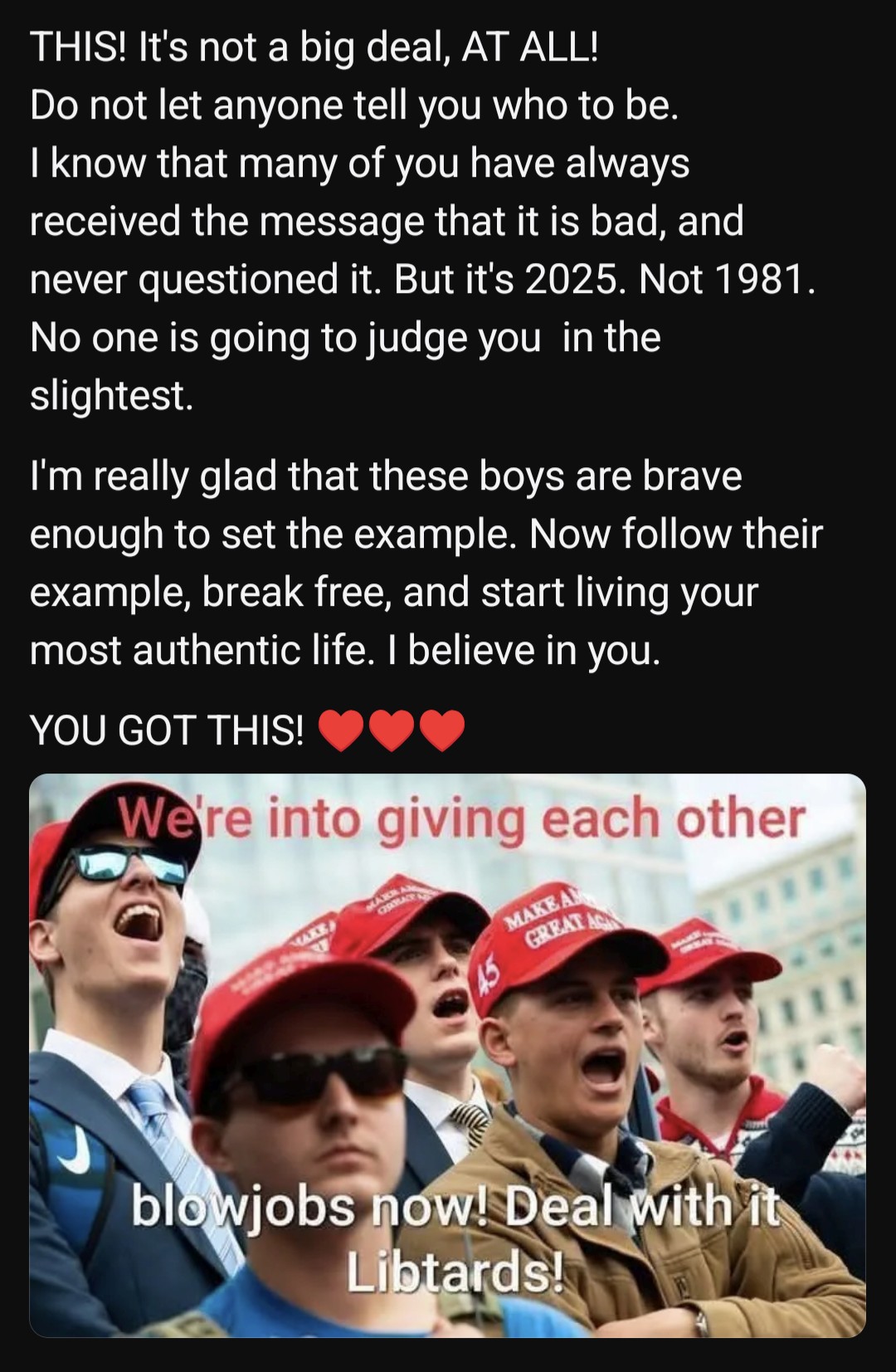 MTZ@lemmy.world to Lemmy Shitpost@lemmy.world · 15 days agoIn these deeply divided times, it's good to see someone trying to spread unity and tolerance.imagemessage-square46linkfedilinkarrow-up1485arrow-down111