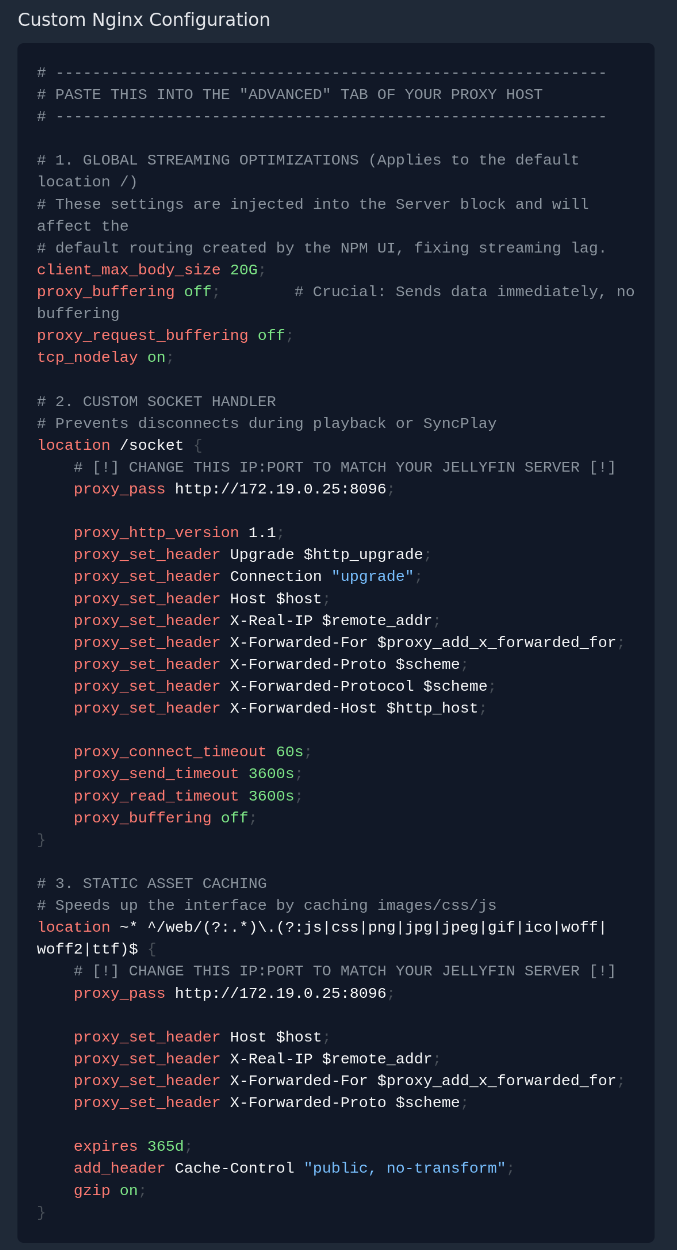 So long story short here: I’m using AI to write this Nginx Proxy Manager advanced config for Jellyfin because I’ve been having lots of issues with videos starting and stopping. Am I stupid? Any advice would be welcome!