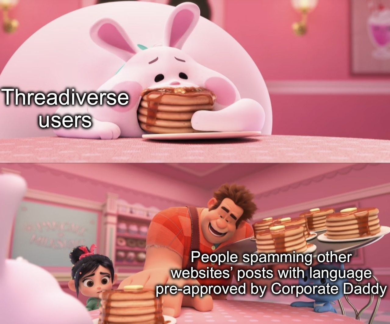 - Ralph appears and his hand is stretched towards a plate that is in front of the bunny. What’s he doing? The bunny had pancakes in the first panel, that’s where we’ve seen a plate before, must be the same plate, he must be taking the plate (from the bunny’s mouth, no less).