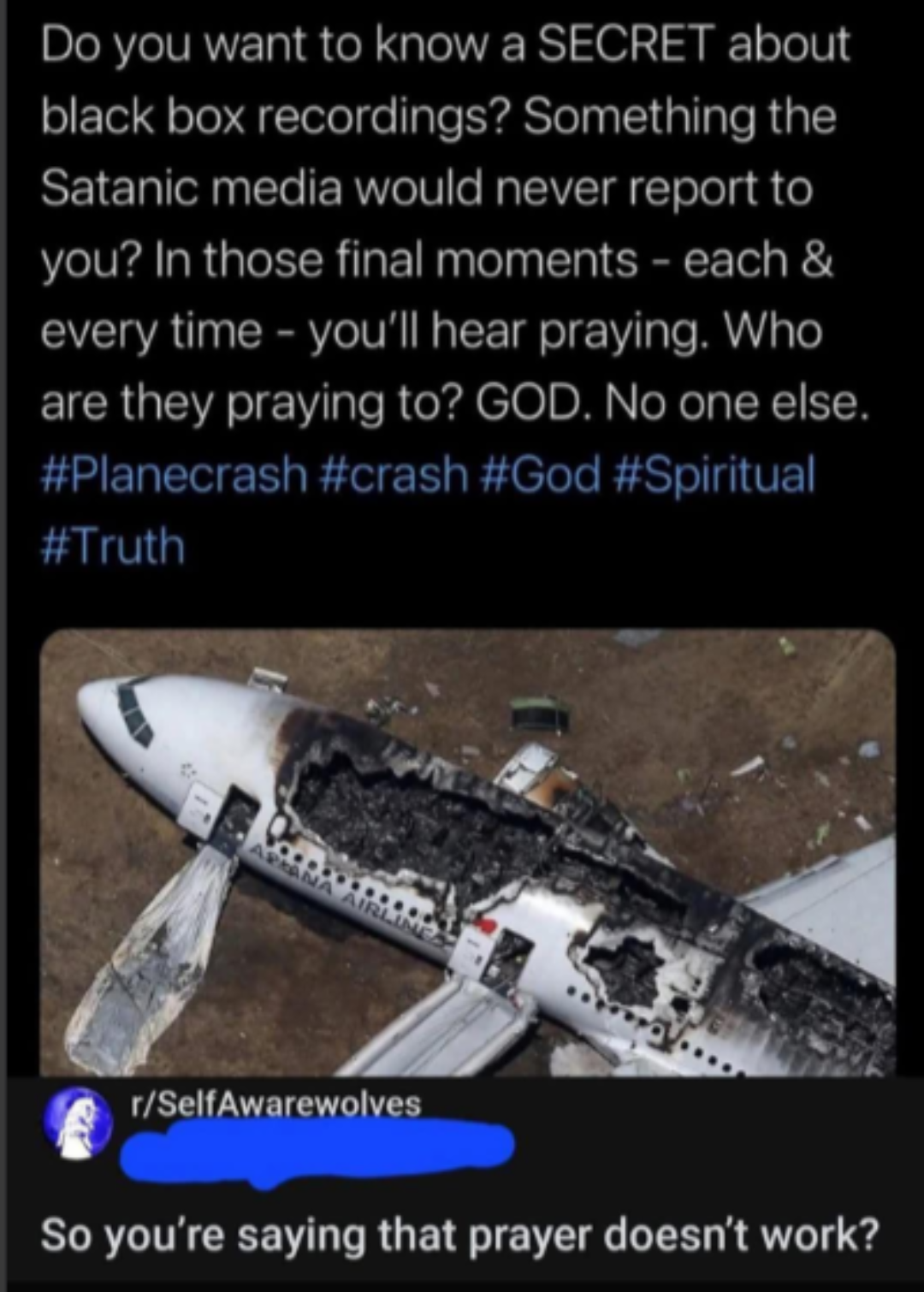 I am constantly praying to god, and I’ve never been in a plane crash. Checkmate atheists!