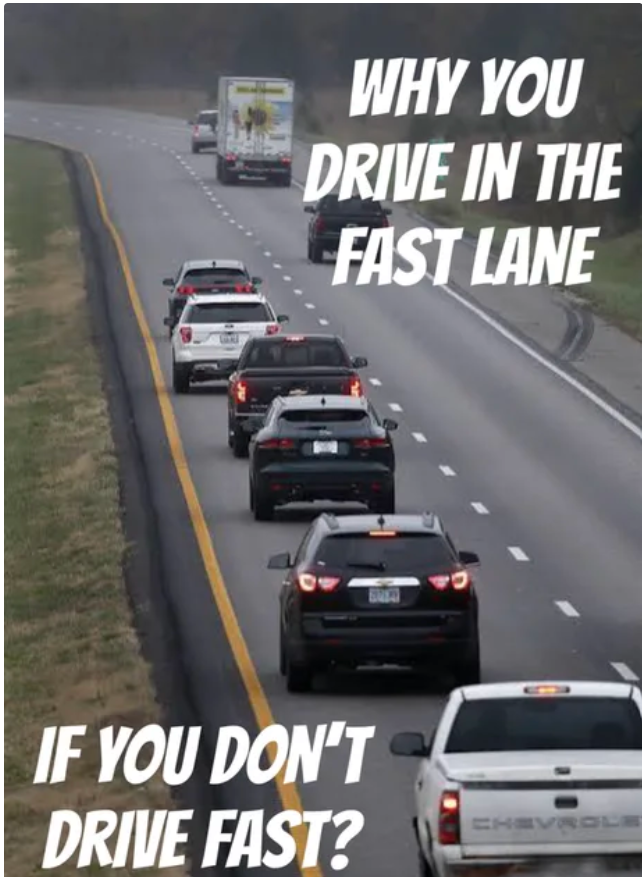 Get in it. Pass someone. Get the fuck back out. If you aren’t passing, you have no business in the passing lane, simple.