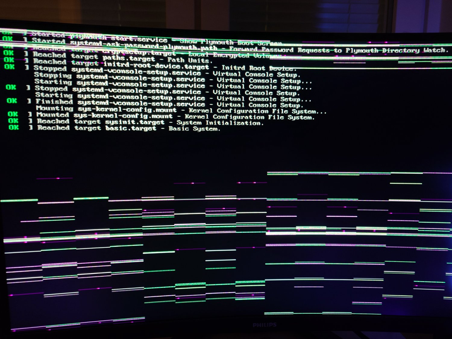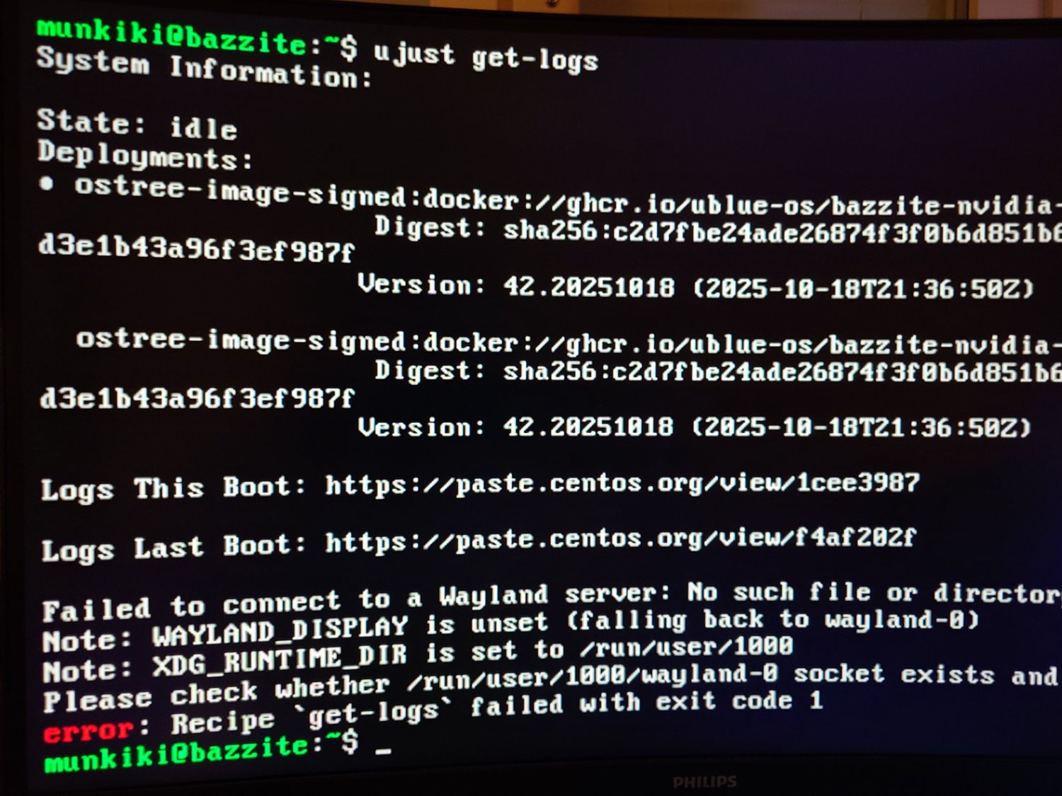 Then blank screen. Ctrl-Alt-F2 gives me a terminal at least and I did just get-logs which gives me the following: