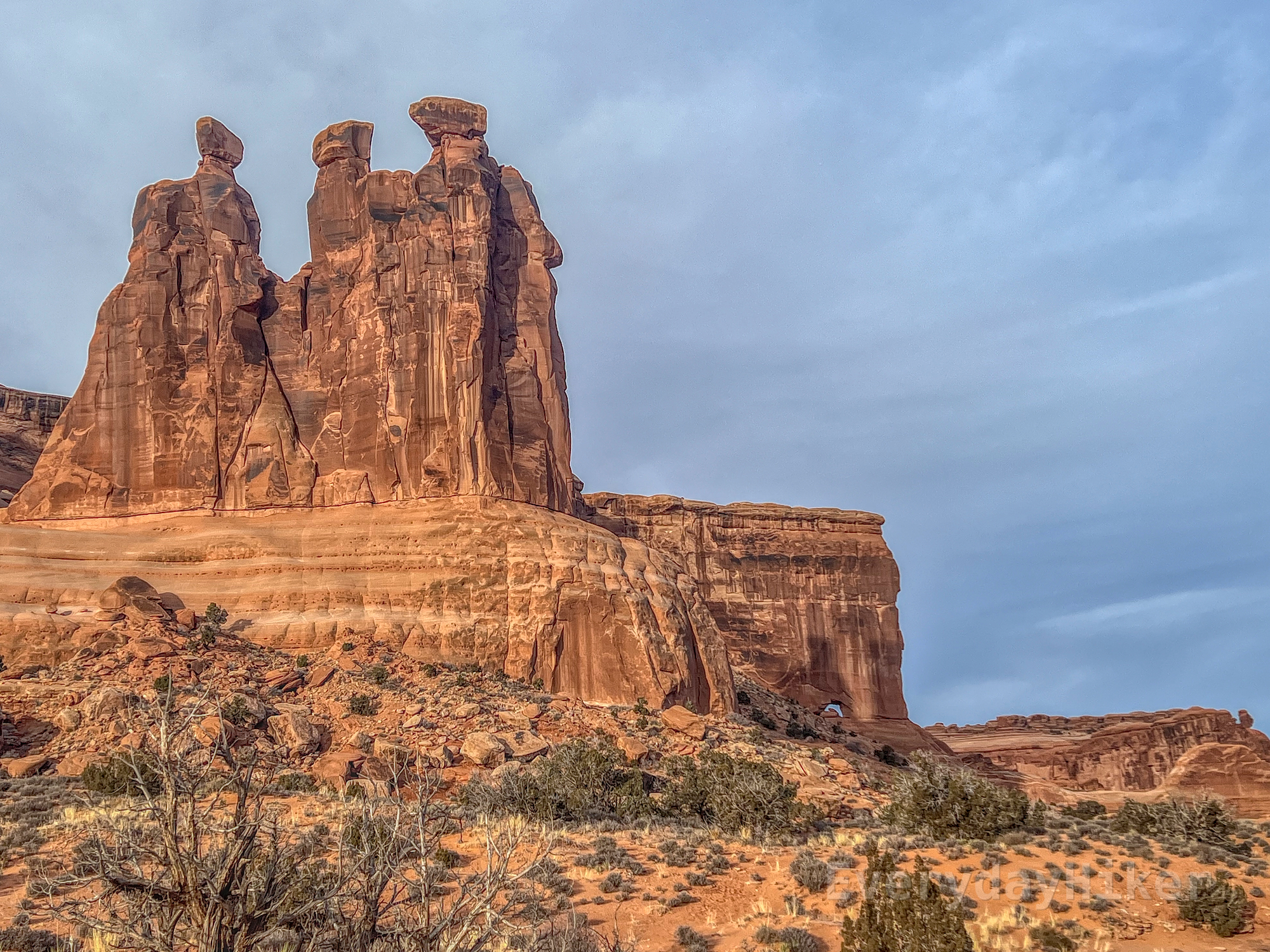 A huge pillar of sandstone that has three tops rising above it, called the three gospels and part of Courthouse Towers. In the lower portion of the slab (right of center), Baby Arch may be seen as a hole through it.