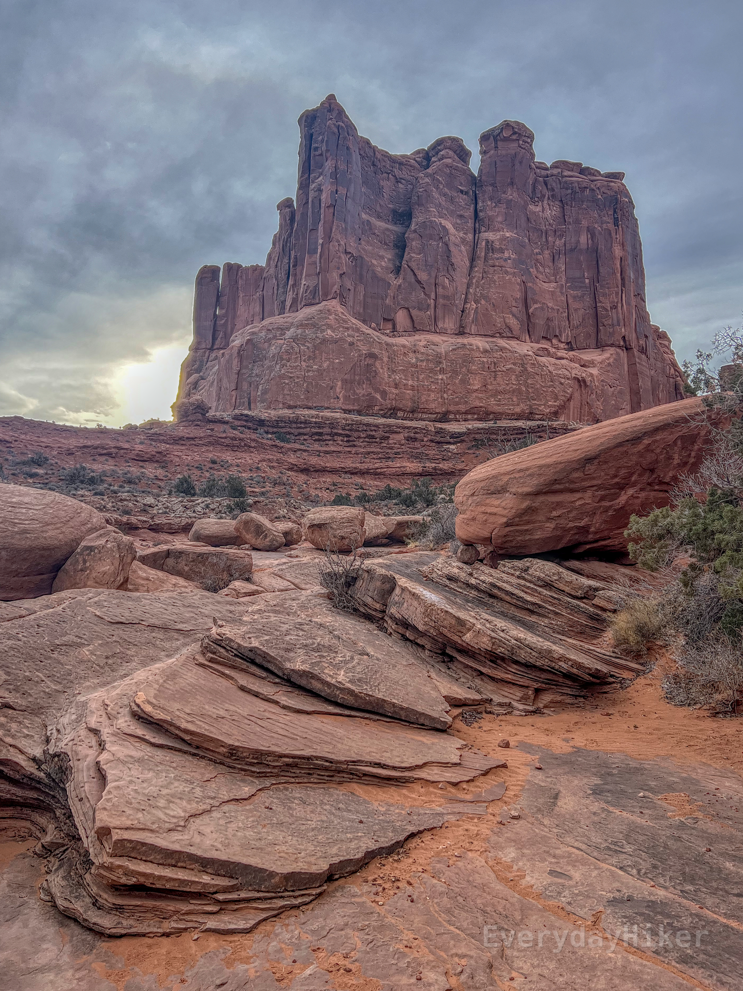 In the foreground, sheets of slanted sandstone formed along the was that makes up the trail, along with some larger boulders. In the distance, a massive slab of rock with some pillars forming throughout under cloudy skies. The early morning sun may be seen poking through the clouds behind the slab, which is called The Organ.