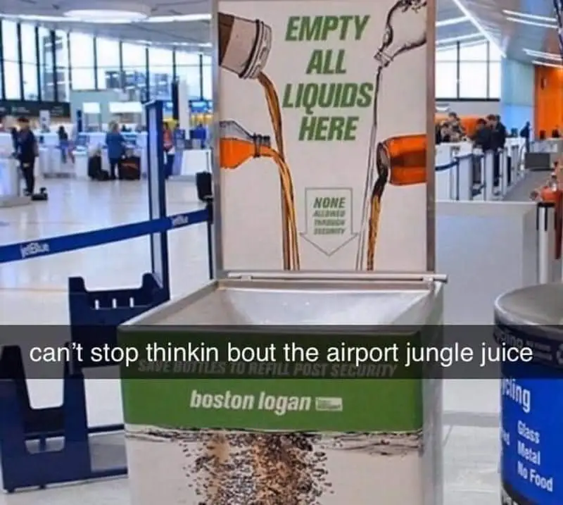 My dad worked at Gatwick Airport as a cleaner in the 70s when he was a teenager. His first week there, a woman drops a duty free bag with a bottle of booze in it and he rushes over to clean it up. He’s just about to put the bag, full of liquid booze and broken glass, in the bin when one of the senior porters stops him and tells him to bring it in the back. Turns out they had a filtration system in the break room for this exact scenario. They’d pour the booze out of the plastic bag and through a sieve that would collect all the broken glass, it would all go into a big container at the bottom and voila, free booze! They offered my dad some, but he declined. Anyway, I guess if you were working at Gatwick in the 70s you could have had a chance to drink some airport jungle juice, you’d just need to be brave enough.