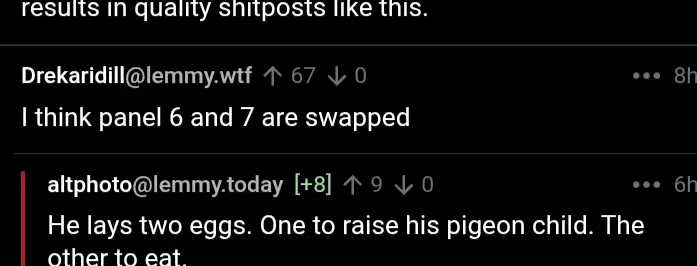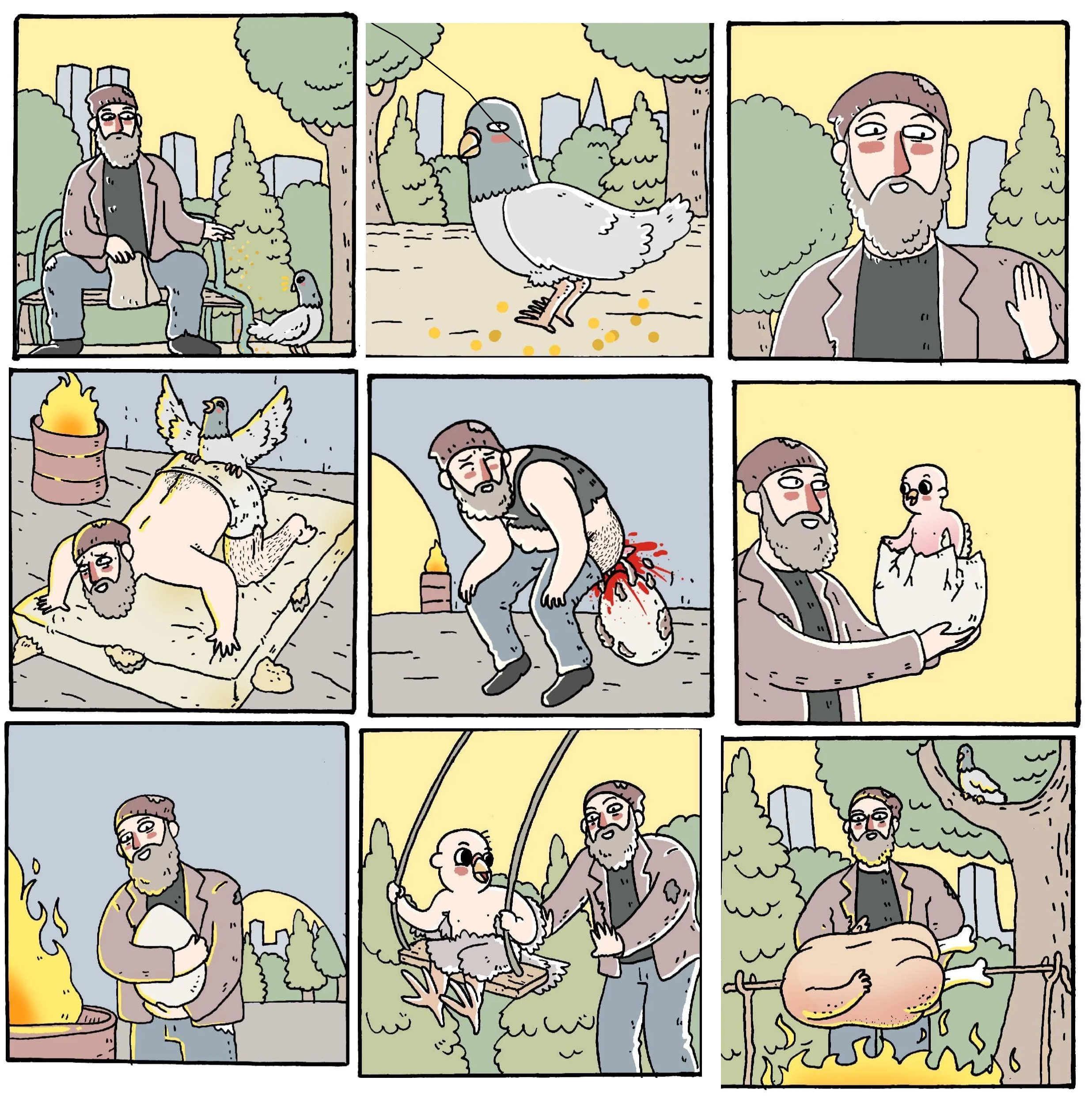 He lays two eggs. One to raise his pigeon child. The other to eat.
