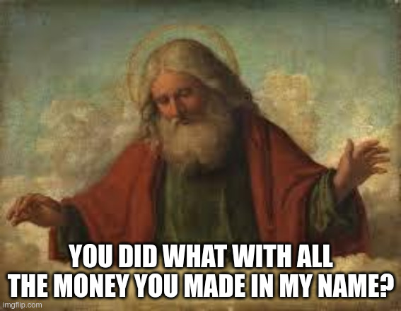Stuff like this is why I don’t publicly practice my faith with a specific lineage of Christ believers. Money corrupts if there is not honor or values. Also fuck them for not actually using to help people but themselves. That’s why I want to remove Tax exempt status from mega churches. (Not the smaller churches, just the mega ones.)