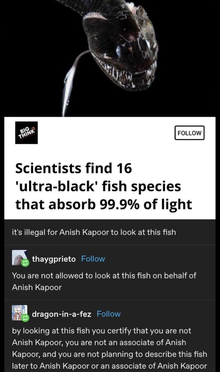 Kapoor didn’t invent shit. He bought sole rights to use the medium in art (no loss at all to the art world for which it is not especially useful) and that’s just a dickish thing to do. Kapoor has always been a dick though. Stuart Semple’s Culture Hustle made acrylic pigments that eat almost as much light and are safe to use. Culture Hustle has a lot of neat stuff for artists and hobbyists.