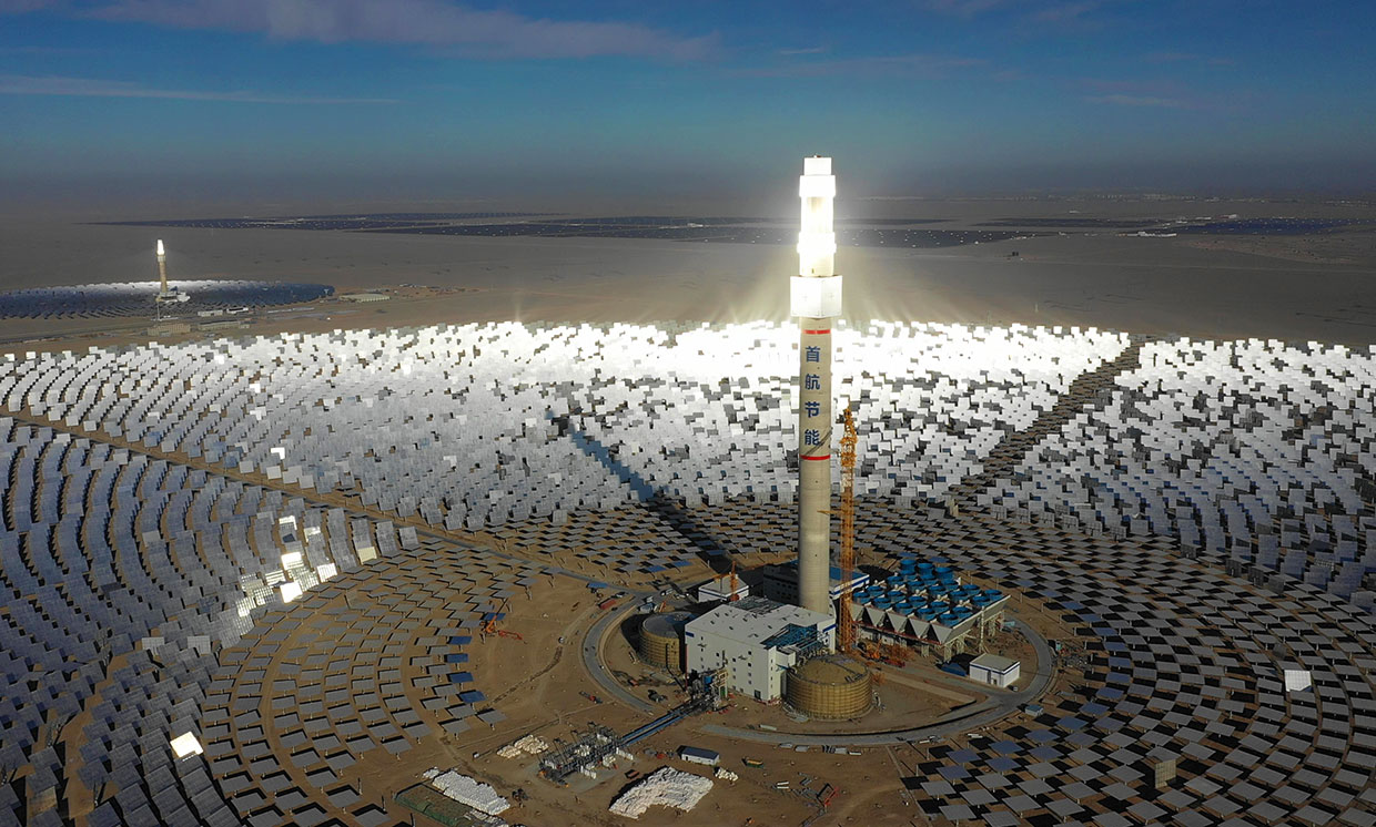However to reach those temperatures a simple panel isn’t enough so what you have is a ton of mirrors over a large area all focusing the sunlight on a central tower were the salt-melting happens.