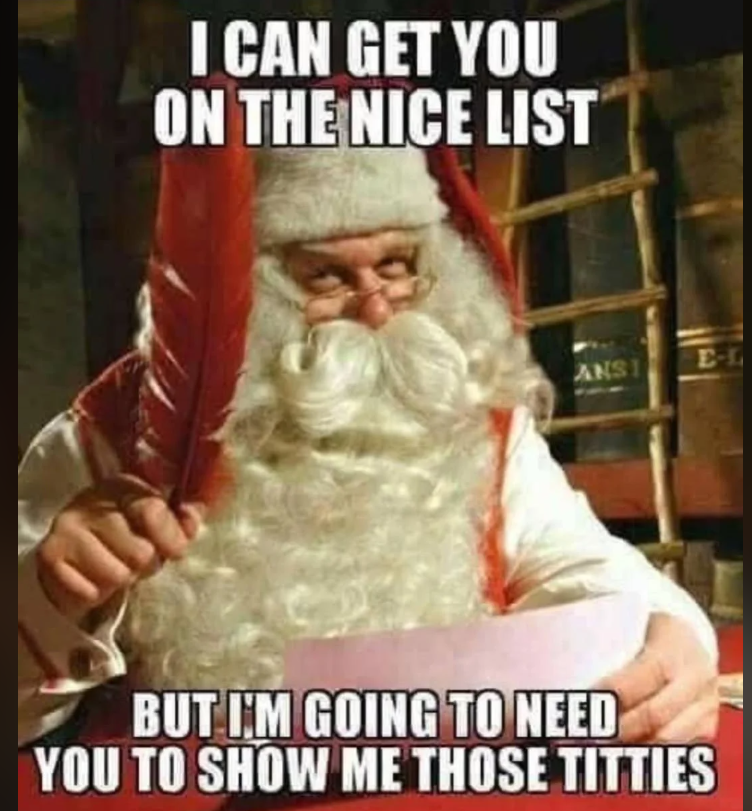 And what’s the big deal about showing them? If Santa asked me to drop my pants to get on the nice list I’d have no problem doing it
