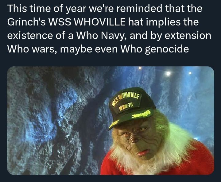 minus-squareClay_pidgin@sh.itjust.workslinkfedilinkEnglisharrow-up12·3 months agoI don’t recall if the hat is in the actual movie. There are no armed forces of any kind depicted. I think there’s a Who police officer. This is the Jim Carrey version of The Grinch.