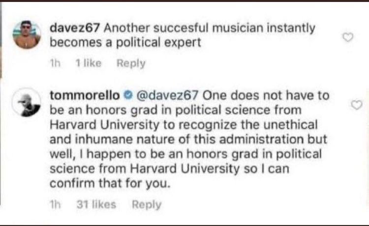 I still love the post where some dude bitches at Tom Morello something like “I liked RatM when you weren’t political” and Tom shot back asking him to name a single song that wasn’t political so he could delete it.