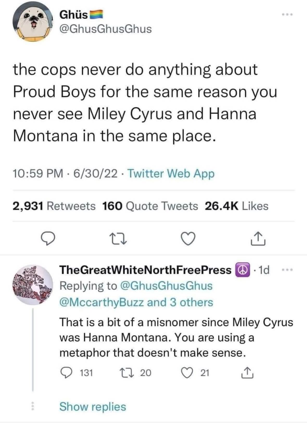 Why did the author compare cops and proud boys to Miley Cyrus and Hannah Montana?
