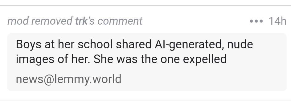 Yeah that’s the suck thing about Reddit, all those removed posts. Good thing that doesn’t happen here on Lemmy Utopia…