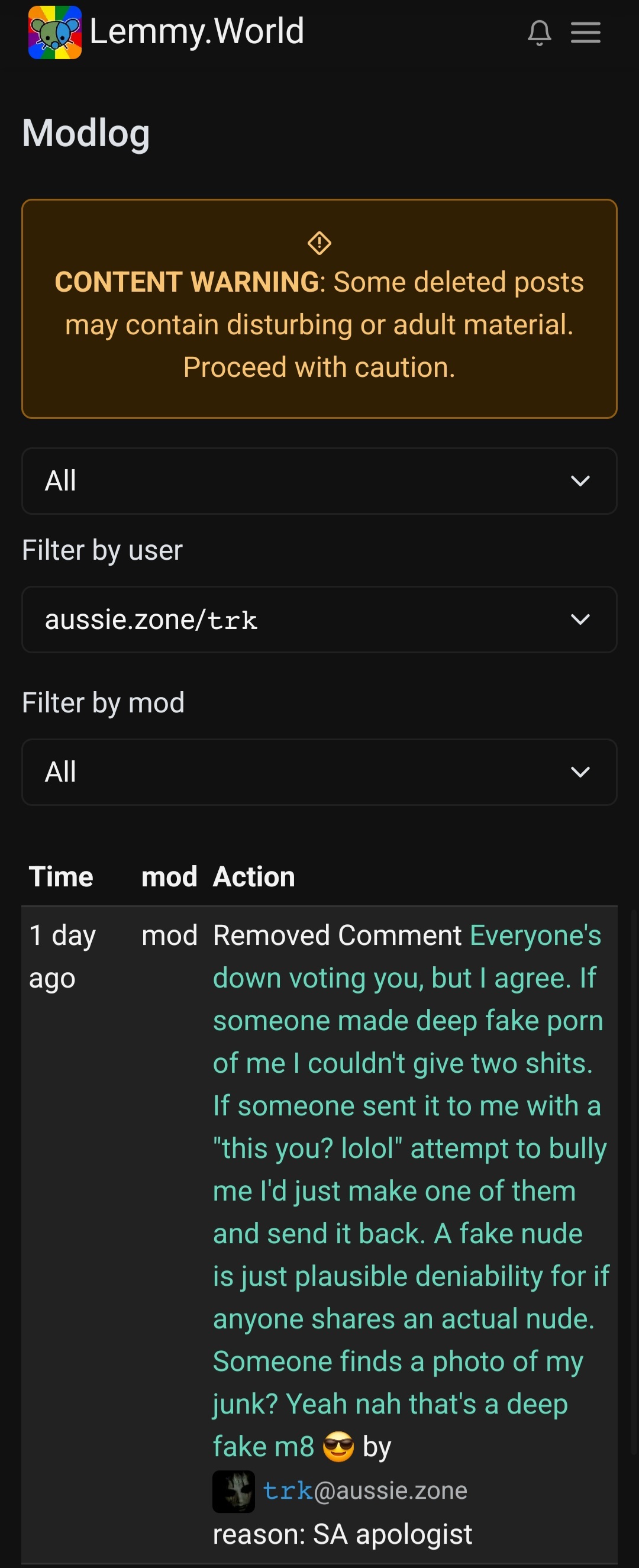 I mean, I take your point, but compared to Reddit, where there is no record unless a third-party website happens to archive it before the mods remove it, the Modlog is very transparent.