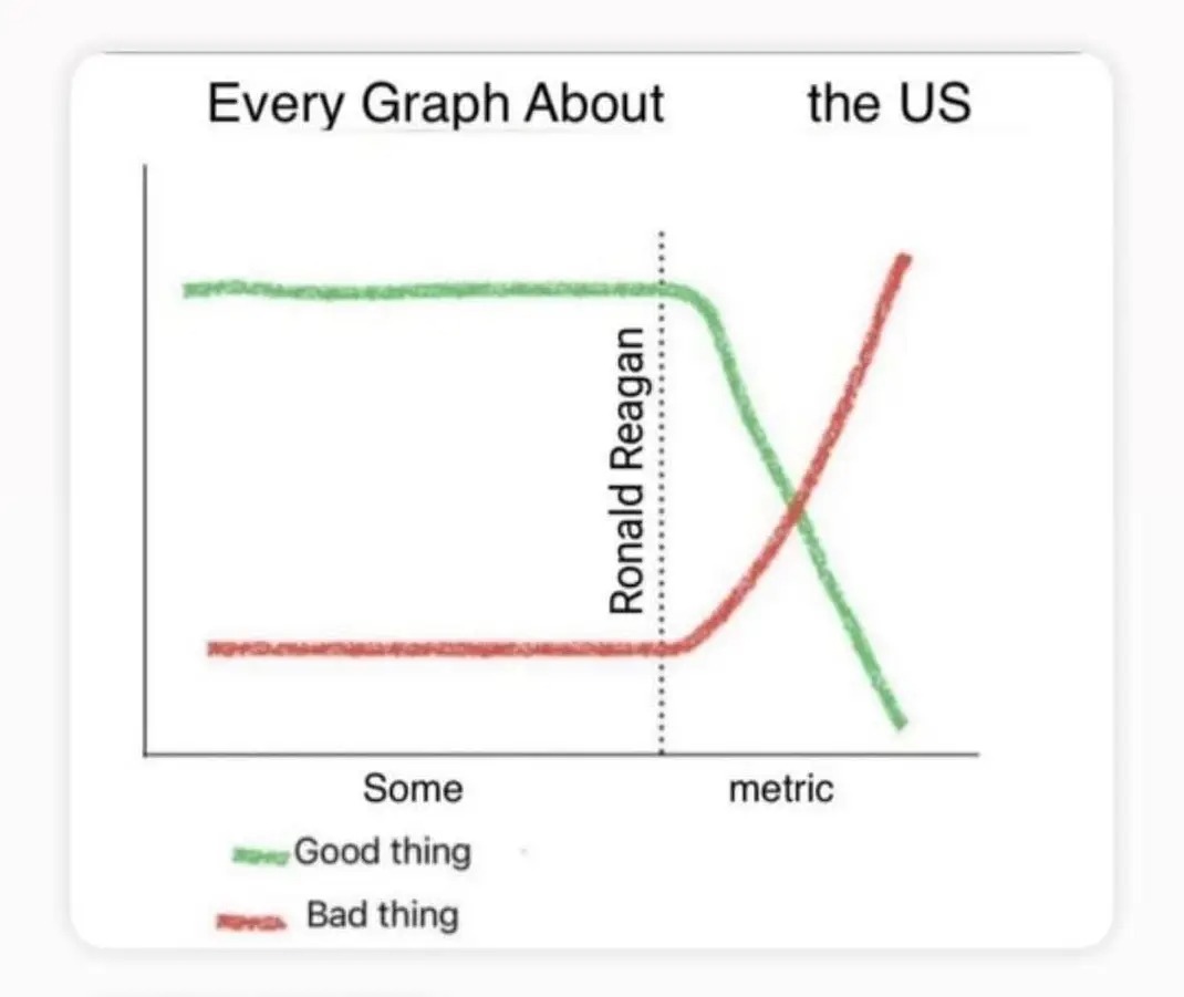The top comments seem to have a lot of people from the US seem to be ignoring the rest of the world exists and screaming Reagan (the US president from 1981-1989). I honestly don’t know how accurate that is but it is obviously not nuanced and probably biased by anti-Trump sentiment