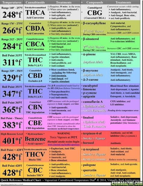 For starters, to actually benefit the most from the cannabis (pot) trichomes, you actually want to basically cook it instead of catching it on fire. Similar to vaping. These are the tempratures you want to achieve for each cannabinoid to be released from the dried bud.
