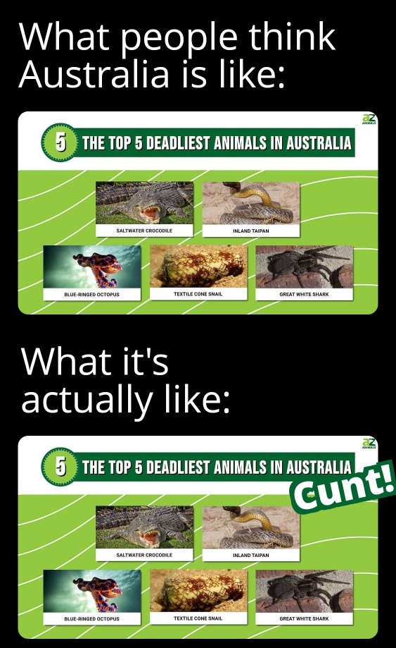minus-squareAbsolutelyNotAVelociraptor@sh.itjust.workslinkfedilinkarrow-up23·1 month agoIt’s Australia, if they say they have an 8 legged venomous shark, I believe them. I mean, they have an egg-laying mammal with beak and venomous spurs that uses electrolocation…