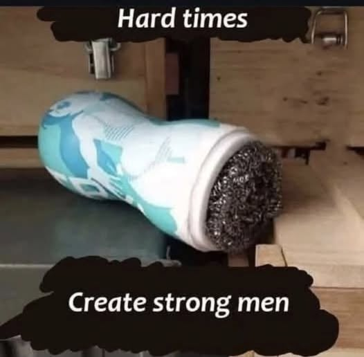 so the joke is that people usually put sponges in them, because there is really nothing else you can put in it that feels good on literally the one of the most sensitive part of your body. and steel wool would not feel good on your dick. so the joke I’d that “hard times= when I’m hard and don’t have anything to fuck create strong men= so I’ll fill this fucktube with steel wool instead of sponges.”