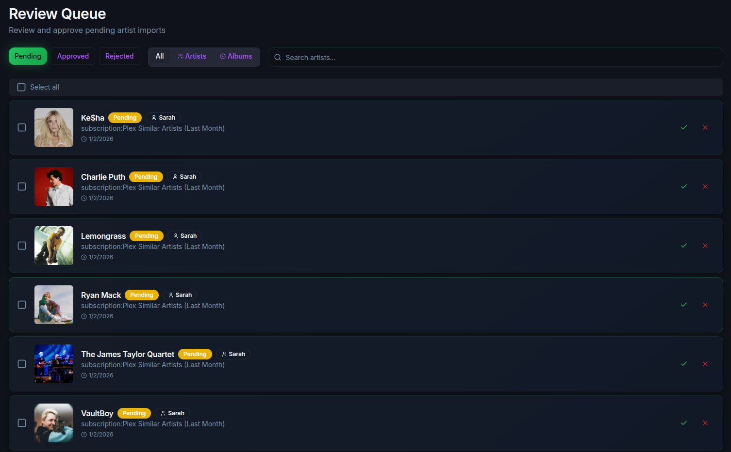 - Gives you a review queue to approve or dismiss discovered artists