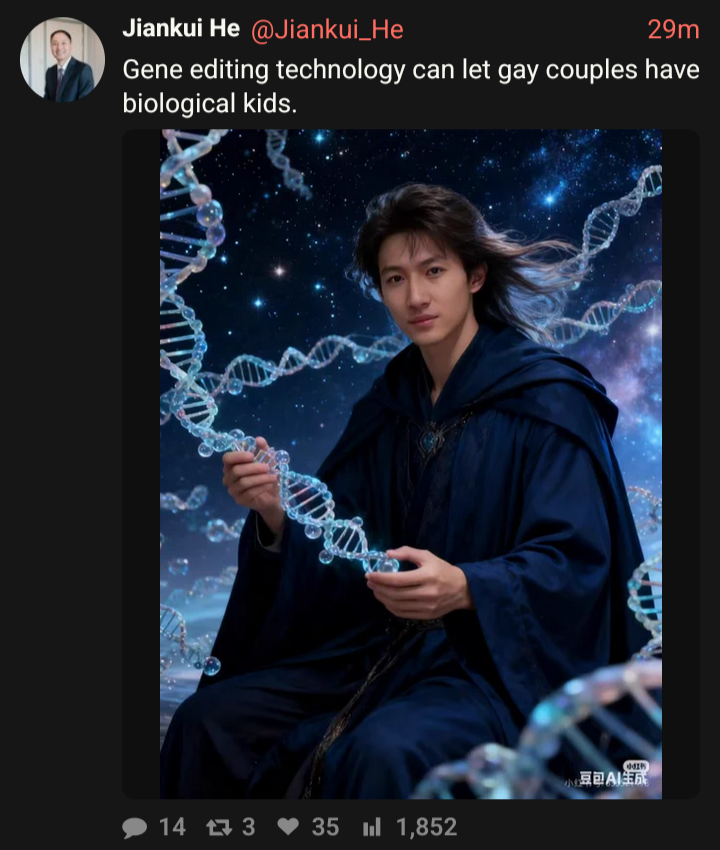 (yes, this is a real post by someone who also happened to have actually been arrested for gene editing embryos)