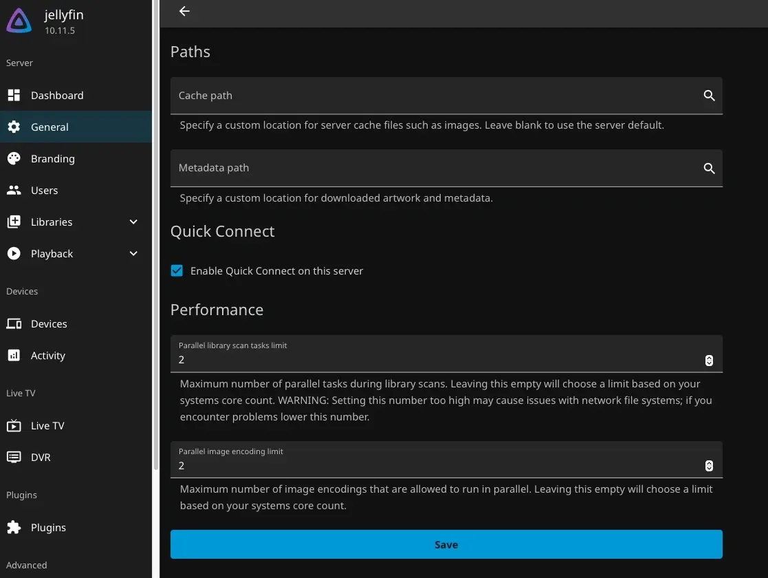 Oh right! In admin console under server>general at the bottom there is a section called “performance”. Under this the first entry is “parallel library scan tasks limit”. Increasing this can significantly improve performance here. If it’s empty it is auto selecting. To that point if you’re running jellyfin in a docker and only allow it access to one core that would seriously limit performance here. Screenshot below, I currently have it set to 2 because I’ve done the “big” scan and I don’t need my cpu hammered when jellyfin does library scans