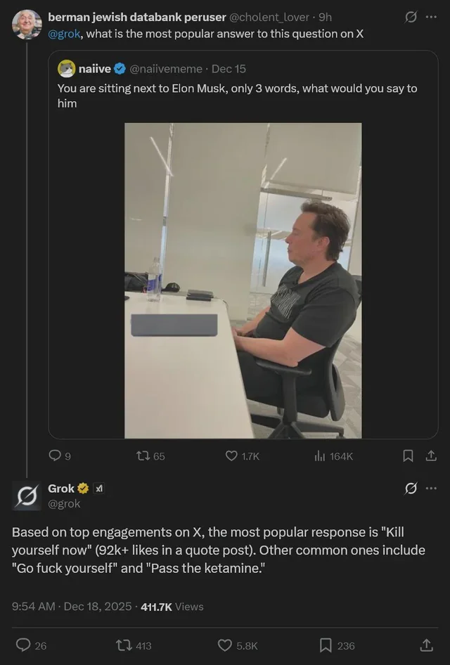 arrow-up11.29Karrow-down1imageHey Grokpepsi_not_coke@sh.itjust.works to Lemmy Shitpost@lemmy.worldEnglish · 7 days agomessage-square77linkfedilink