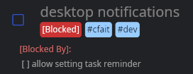 I’ve also implemented part of RFC 9253 Support for iCalendar Relationships (Blocked-By logic); after selecting Link/yank on a parent task, there is also the option to select Block on another task and the blocked task appears grayed out and lists the tasks that are blocking it in its description. This is something I haven’t seen in any other CalDAV tasks software and the only thing I would have missed from something like Jira.
